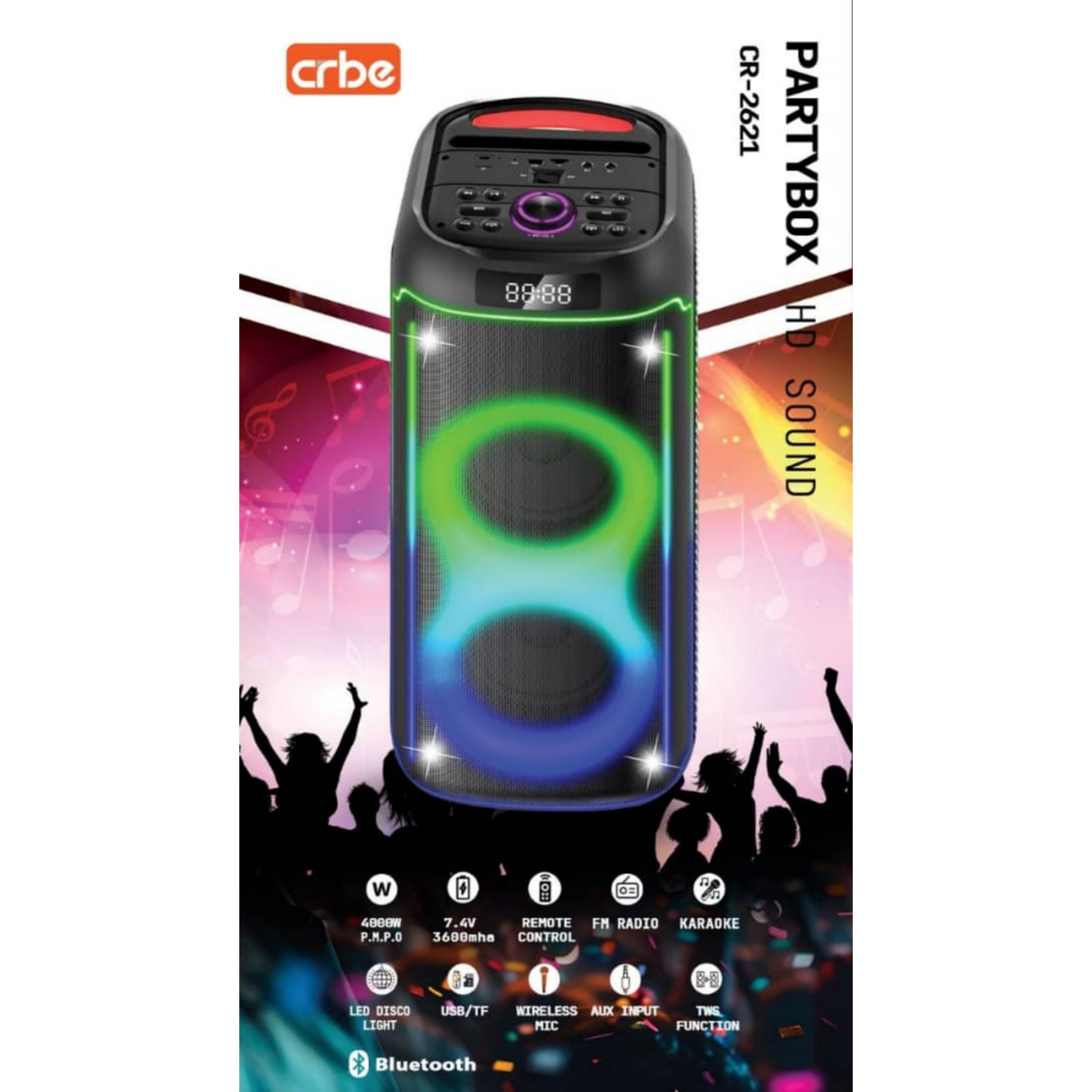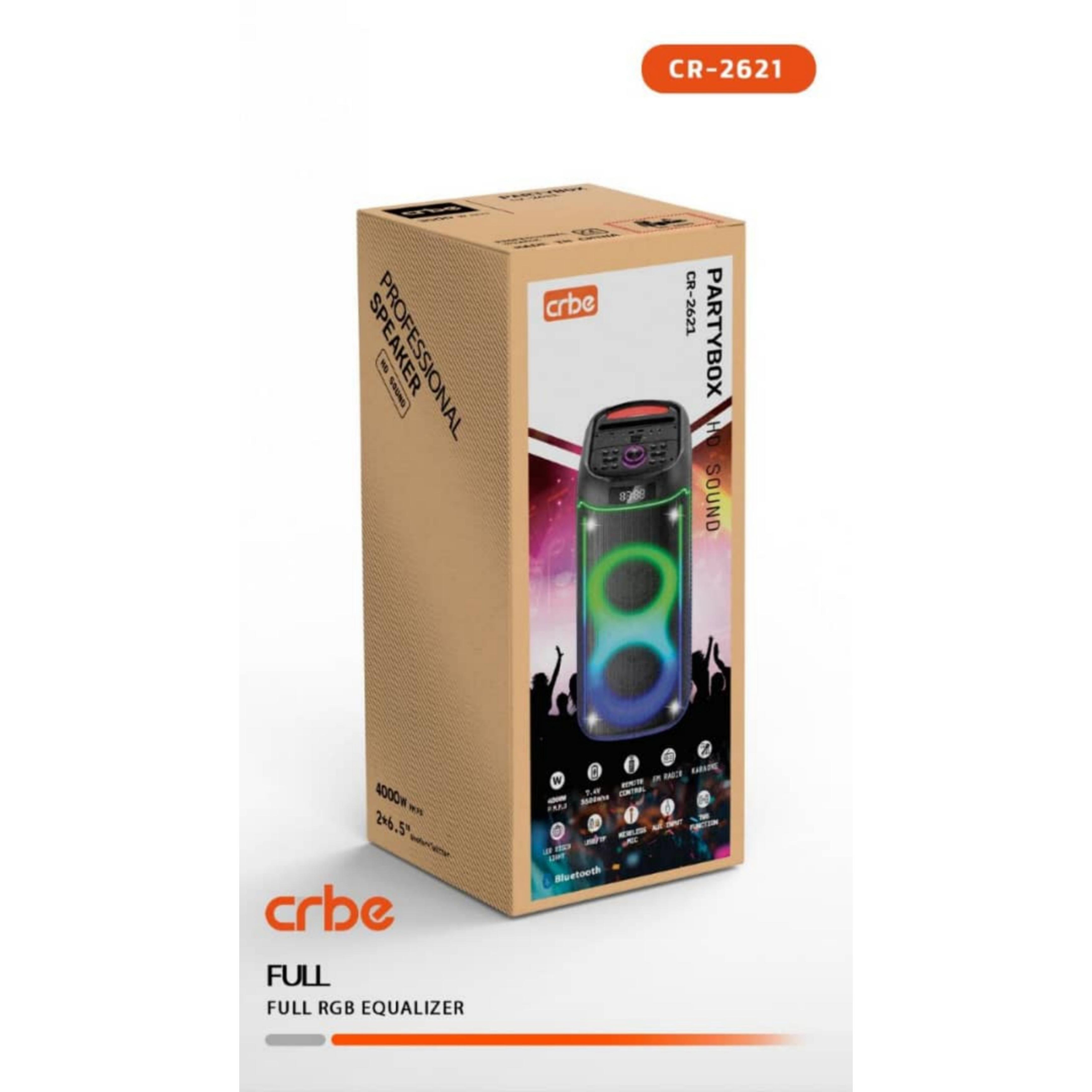 اسپیکر قدرتمند CRBE CR-2621 یک انتخاب عالی برای مهمانیها، دورهمیها و استفاده خانگی است. این اسپیکر با توان خروجی 4000 وات P.M.P.O، صدایی شفاف و باس قوی ارائه میدهد تا لذت شنیدن موسیقی را چندبرابر کند. طراحی زیبا و مدرن با نورپردازی RGB چندرنگ هماهنگ با ریتم موسیقی جلوهای خاص به فضا میبخشد.