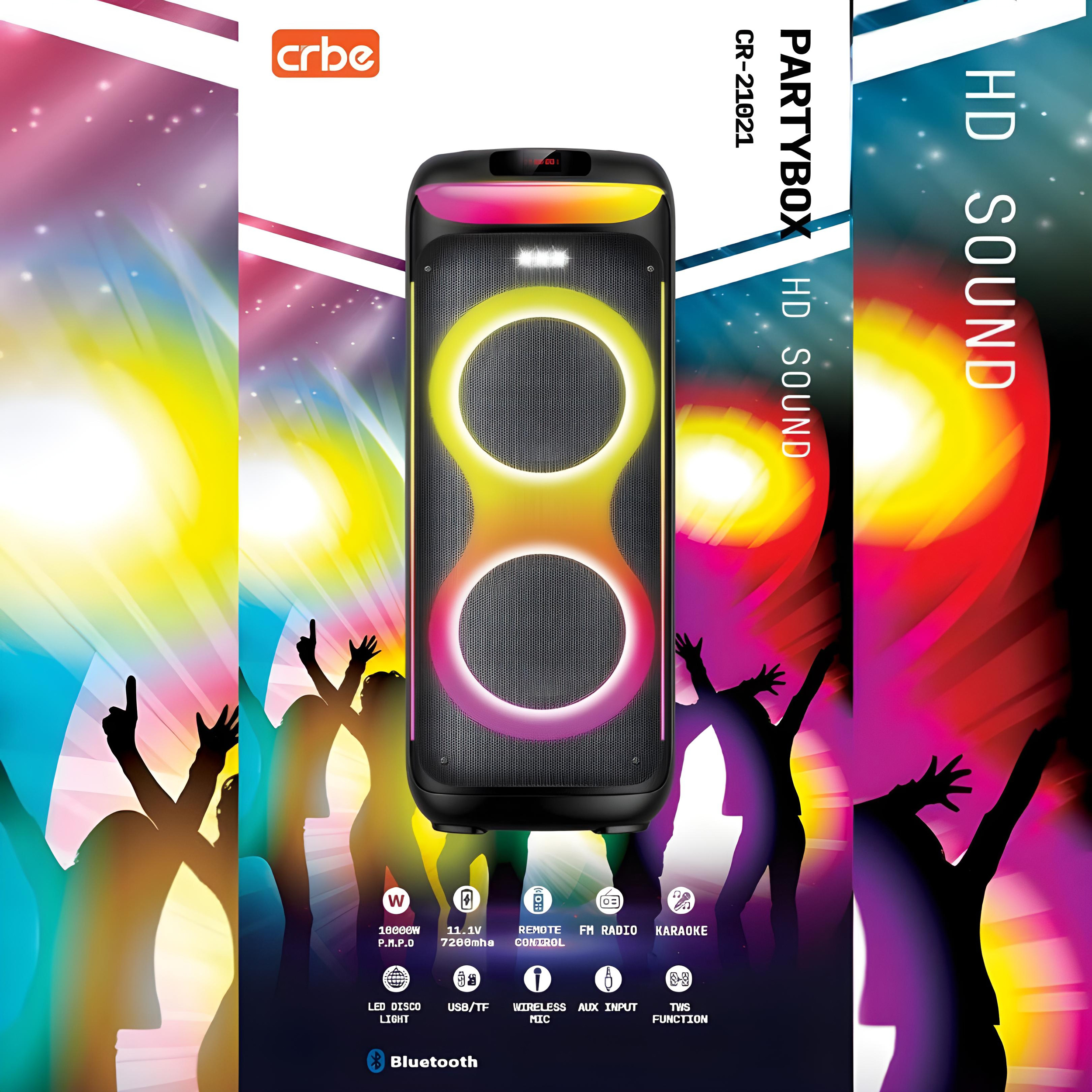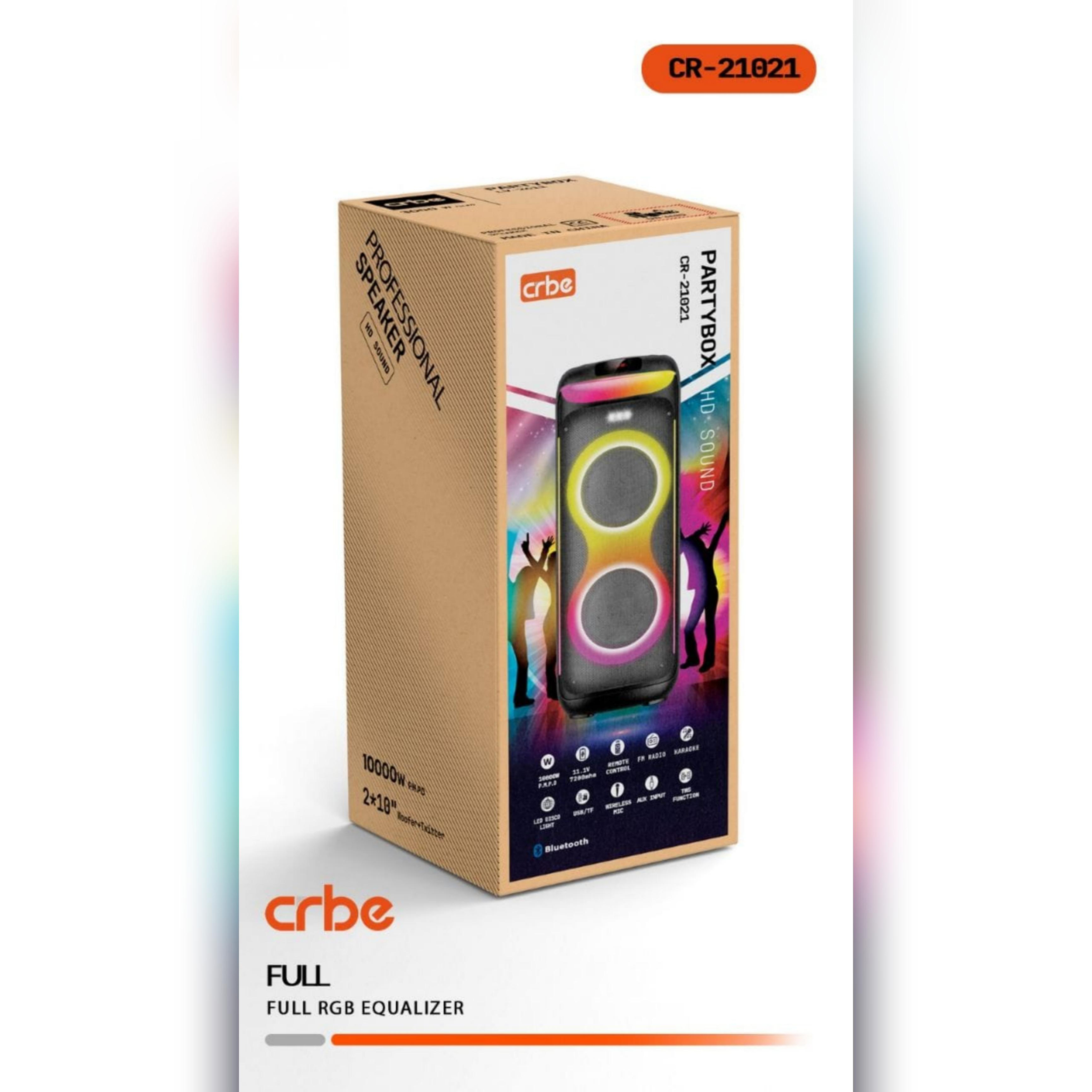 اسپیکر قابل حمل CRBE مدل CR-21021 یک اسپیکر پرقدرت از نوع پارتیباکس است که با توان 10000 وات P.M.P.O صدایی شفاف و قوی ارائه میدهد. این دستگاه مجهز به بلوتوث، درگاه USB و کارت حافظه TF، ورودی AUX، رادیو FM، میکروفون بیسیم و قابلیت کارائوکه (Karaoke) است.