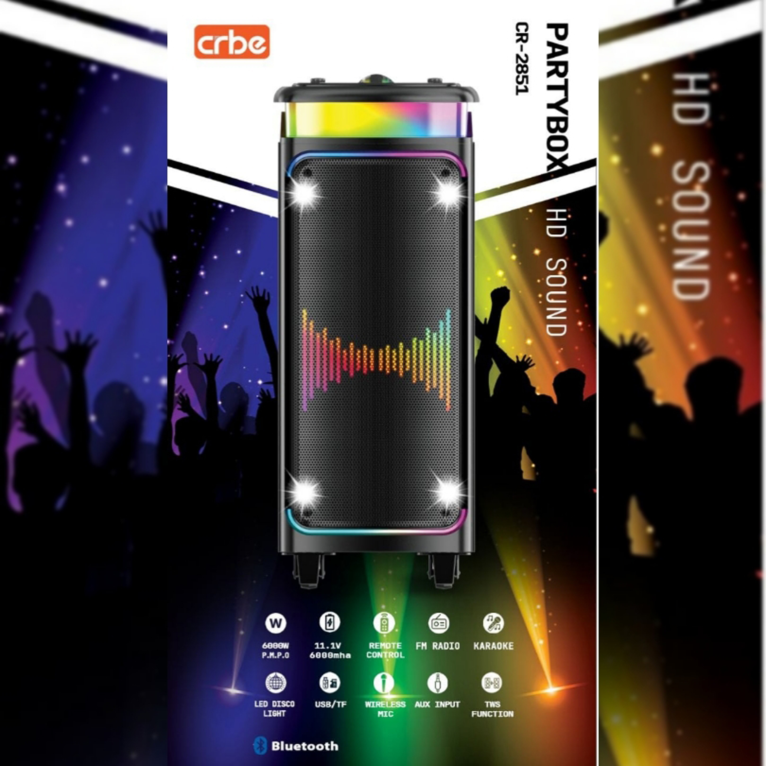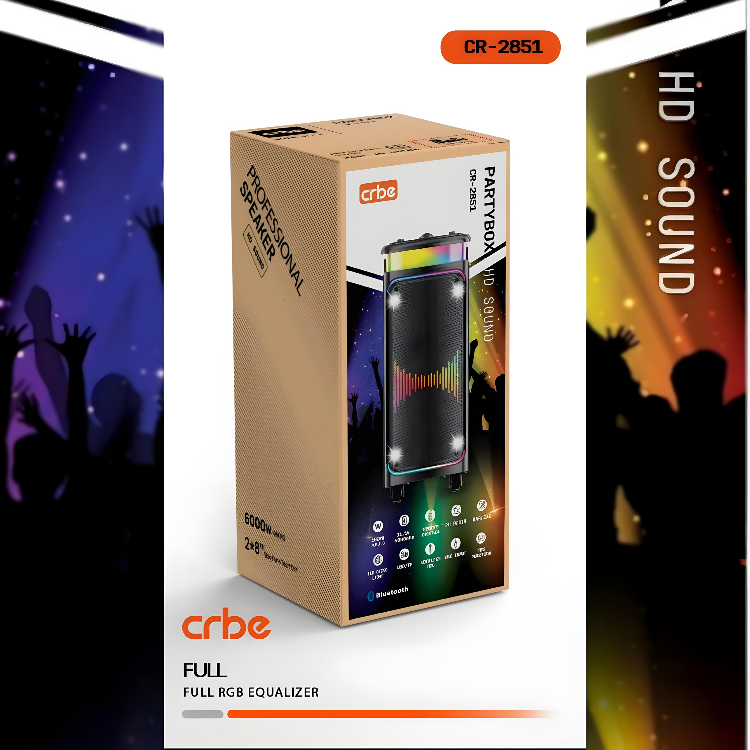 اسپیکر قدرتمند CRBE CR-2851 انتخابی ایده‌آل برای کسانی است که به صدای بلند، بیس قوی و طراحی جذاب اهمیت می‌دهند. این پارتی باکس با توان خروجی 6000 وات P.M.P.O و باتری قدرتمند 6000 میلی‌آمپری (11.1V) تجربه‌ای طولانی و پرانرژی از پخش موسیقی را فراهم می‌کند.