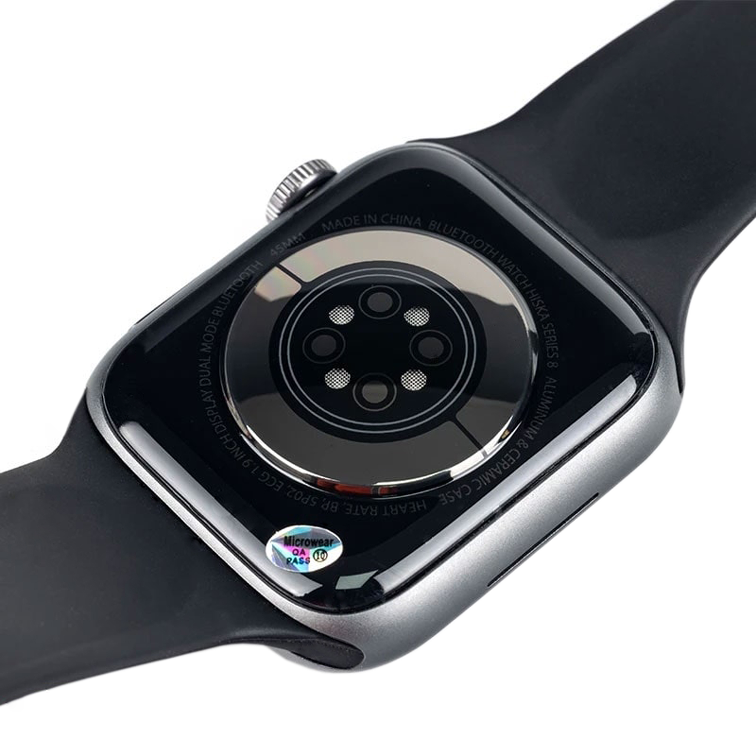 جنس و طراحی: بدنه آلومینیومی مقاوم. بند سیلیکونی با قفل سگکی (Pin Buckle). ابعاد تقریبی قاب 45×38×11 میلیمتر – طراحی مشابه اپل واچ. وزن حدود 50 تا 60 گرم.