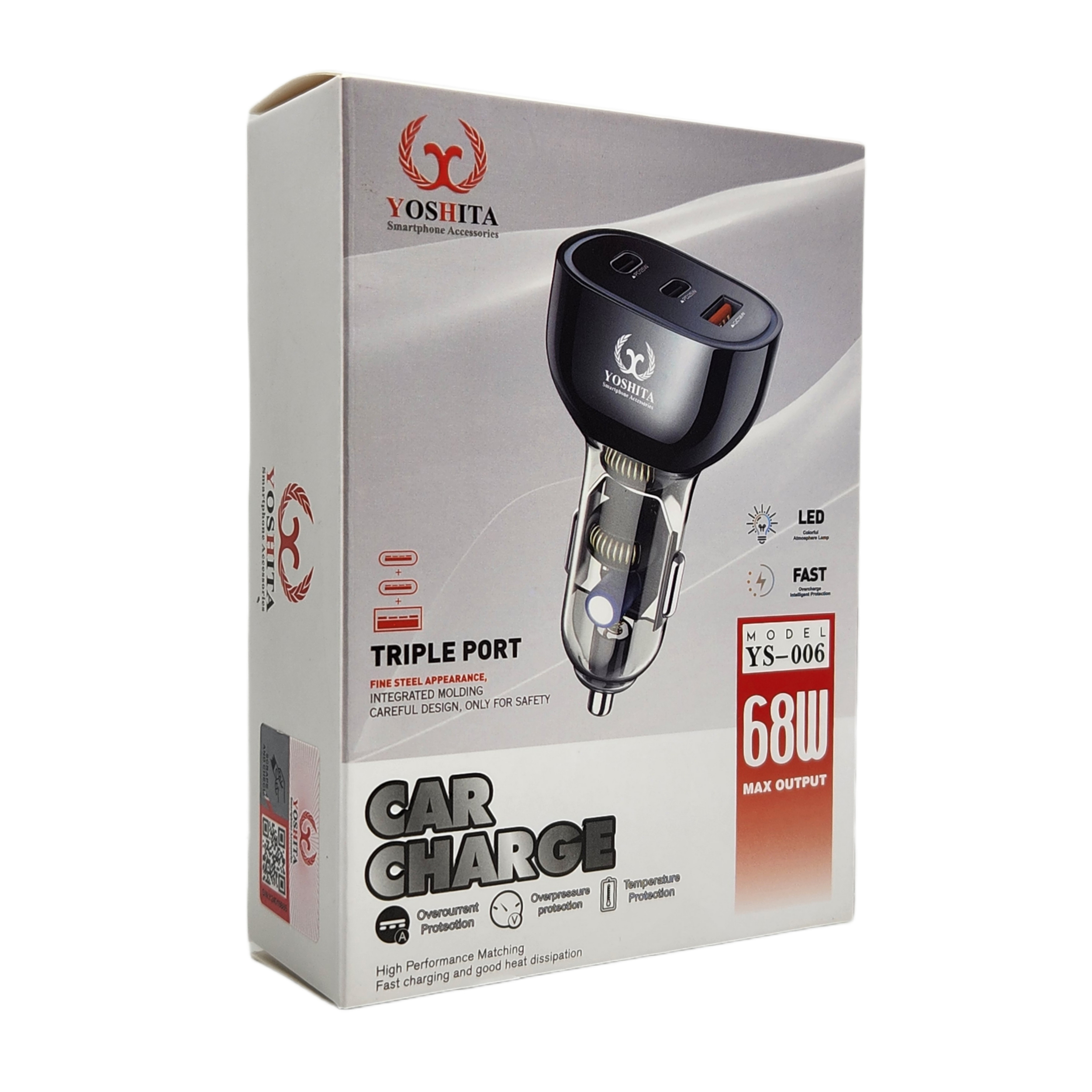 با شارژر فندکی YOSHITA مدل YS-006 تجربهای متفاوت از شارژ سریع را در خودروی خود داشته باشید. این محصول با توان خروجی 68 وات و طراحی سهپورت (دو درگاه USB-C و یک درگاه USB-A) به شما این امکان را میدهد تا همزمان چند دستگاه را با سرعت بالا شارژ کنید.