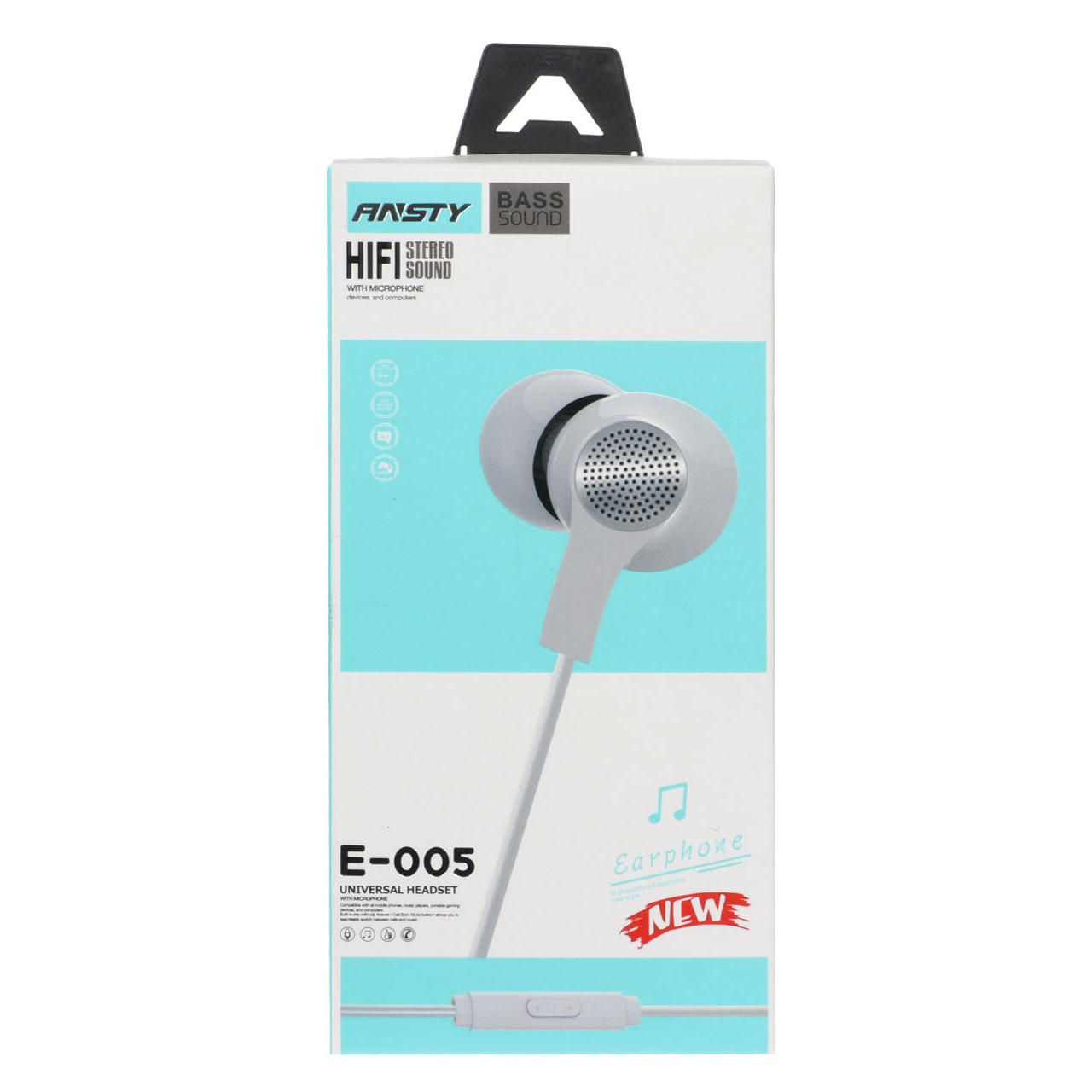 هندزفری (ایرفون ) «E-005» محصولی دیگر از ANSTY است که دارای کیفیت صدای خوب در رنگ های سفید و مشکی عرضه شده و گوشی های سیلیکونی آن باعث شده تا گوش در طولانی مدت خسته نشود. با استفاده از این محصول به راحتی میتوانید به تماس های تلفنی خود پاسخ دهید و به راحتی گوشی موبایل خود را درون جیب و یا کیف خود قرار دهید. همچنین وزن سبک آن یکی از ویژگیهایی است که باعث میشود به راحتی از آن استفاده کرد . رابط هندزفری جک 3.5 میلیمتری است و از نوع دوگوشی بوده و کیفیت صدای مطلوبی و بدون نویز را به کاربر هدیه میدهد.