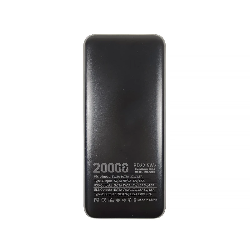 مدل: MG-G۱۲۳ ورودی Micro USB: ۵V/۳A, ۹V/۲A, ۱۲V/۱.۵A ورودی Type-C: ۵V/۳A, ۹V/۲A, ۱۲V/۱.۵A خروجی USB ۱: ۵V/۳A, ۹V/۲A, ۱۲V/۱.۵A, ۵V/۴.۵A خروجی USB ۲: ۵V/۳A, ۹V/۲A, ۱۲V/۱.۵A, ۵V/۴.۵A خروجی Type-C: ۵V/۳A, ۹V/۲.۲۲A, ۱۲V/۱.۶۷A