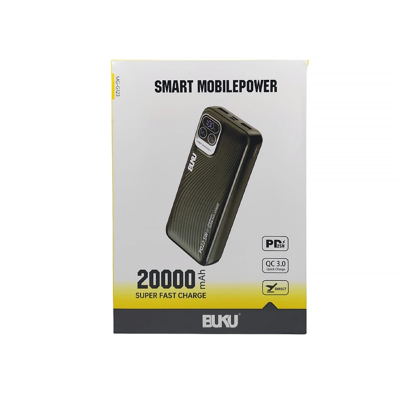 پاوربانک BUKU مدل MG-G123 با طراحی شیک و مدرن خود توجه کاربران را به خود جلب کرده است. این پاوربانک با بدنه‌ای از جنس PC+ABS ساخته شده که علاوه بر داشتن ظاهری زیبا و براق، مقاومت بسیار خوبی در برابر ضربه و خش دارد. این پاوربانک دارای چندین درگاه ورودی و خروجی است که امکان شارژ همزمان چندین دستگاه را فراهم می‌کند. درگاه‌های ارتباطی این پاوربانک شامل Type-C (ورودی/خروجی)، Micro (ورودی)، و USB1&2 (خروجی) می باشد.